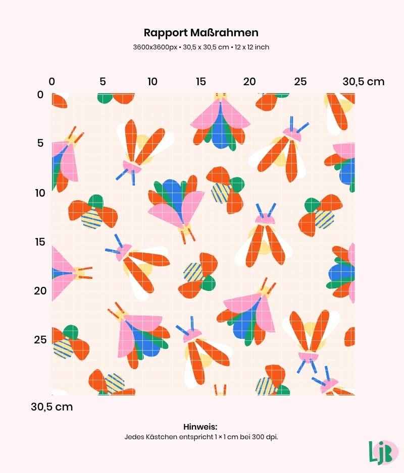 Hier ist was los: Bunte Käfer, flatternde Flügel, tanzende Formen – alles bewegt sich, alles wirkt lebendig. Und trotzdem ist alles stimmig: Farben, Rhythmus, Leichtigkeit. Ein Design für fröhliche Stoffe, verspielte Produkte und alle, die es bunt mögen – aber nicht chaotisch.